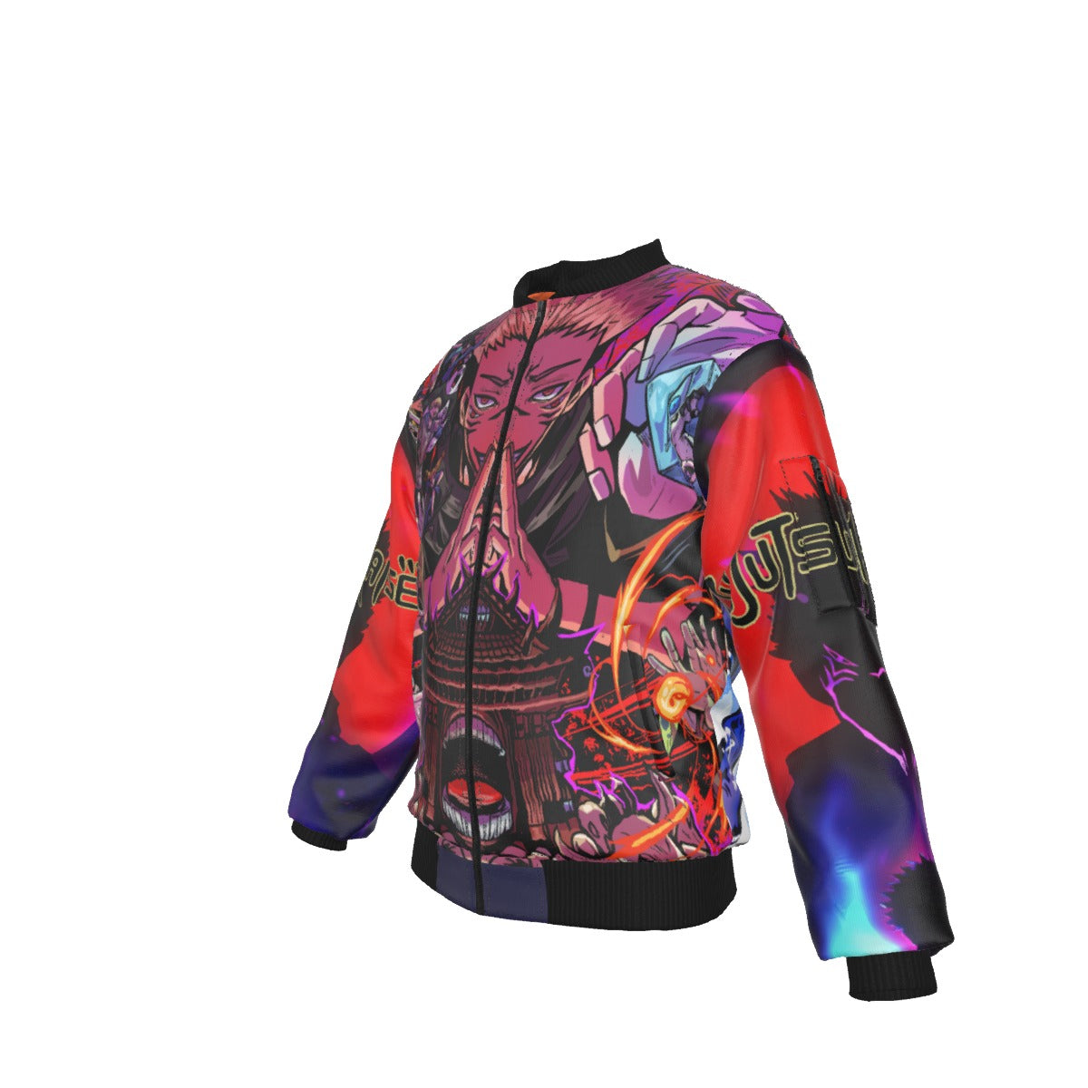 Constructed with windproof woven twill fabric (100% polyester), this bomber jacket keeps you warm while delivering a sharp, commanding silhouette. The intense cursed-energy inspired artwork radiates menace and authority, while the orange 100% polyester lining adds a hidden flash of power beneath the darkness.