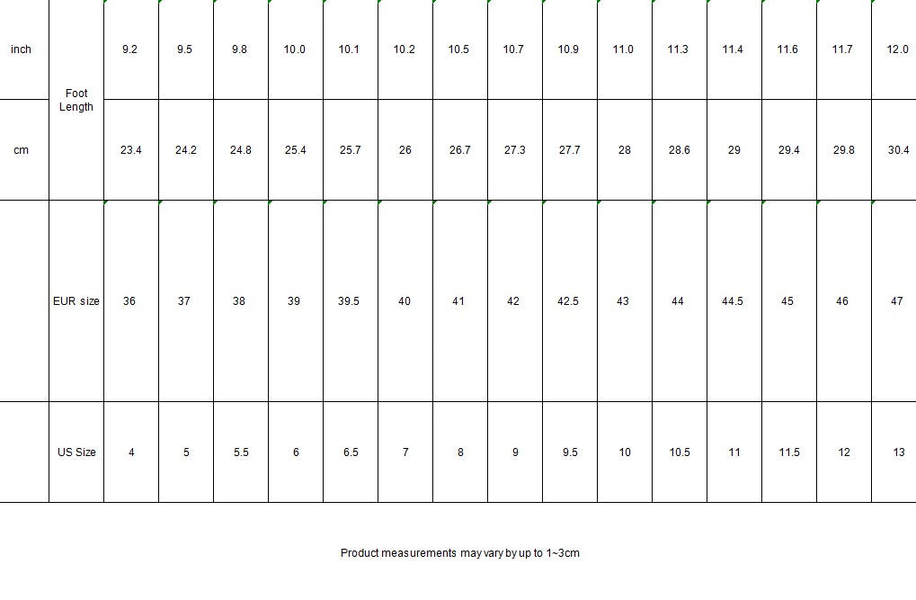 | EUR Size | US Size | Insole Length(inch) | Insole Length(mm) |